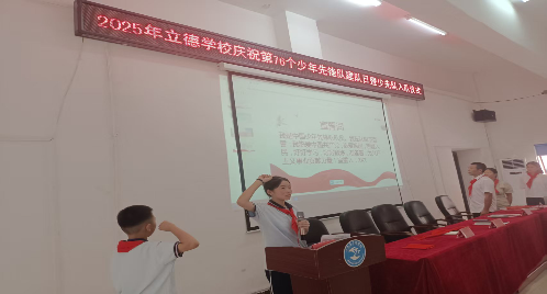 【永州】强国复兴有我 争当新时代好少年 ——宁远县立德学校开展庆祝少先队建队76周年暨新队员入队仪式 中国普法教育在线湖南永州宁远工作站讯:(通讯员:周小玲 黄华军 刘超云)10月13日,值中国少年先锋队建队76周年之际,宁远县立德学校一号报告厅内队旗飘扬,气氛庄重而热烈。学校少先队大队部以“强国复兴有我,争当新时代好少年”为主题,为新队员举行了一场庄严而难忘的入队仪式,学校领导、各班优秀少先队员代表及学生会成员齐聚一堂,共同见证了这一光荣时刻。 仪式在激昂的《义勇军进行曲》中拉开帷幕,全体师生高唱国歌,注视着国旗冉冉升起。在庄严的队歌和出旗仪式后大队辅导员周小玲宣读了新队员名单,并由优秀少先队员为新队员佩戴上鲜艳的红领巾。在优秀少先队员代表的带领下,新队员们面向队旗,高举右拳,进行了庄严的入队宣誓。 仪式上,学校党支部宣传委员、德育副校长黄华军为新队员们送上寄语。他强调了红领巾的荣誉与责任,并希望队员们立志向、勤学习、修品德,努力成长为担当民族复兴大任的时代新人。最后,在大队辅导员的带领下,全体队员铿锵呼号,“时刻准备着”的誓言响彻会场。 此次建队日活动,不仅为宁远县立德学校少先队组织增添了新鲜血液,也让全体少先队员接受了一次深刻的爱国主义教育和革命传统教育。相信在星星火炬的照耀下,宁远县立德学校的少先队员们将携手共进、共同努力,让红领巾在新时代的阳光下更加鲜艳夺目。 (编辑:李爱华 责编:邓明平)