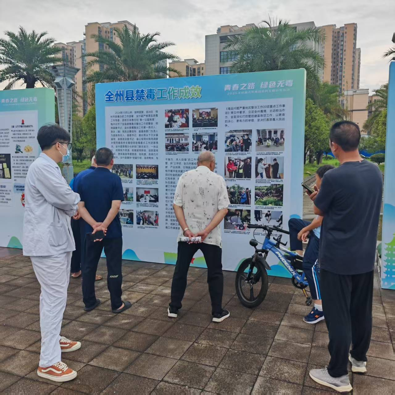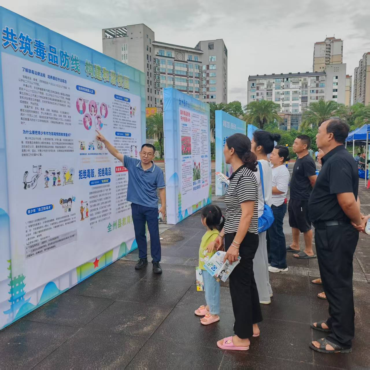 多元宣传浸人心,禁毒意识“横向到边”。打破传统“单向灌输”模式,全州县坚持“贴近群众、贴近生活、贴近实际”原则,推动禁毒宣传从“广覆盖”向“深融入”转型,实现场景、形式、对象全维度渗透。 场景融入无盲区,将禁毒元素嵌入农贸市场、公交站点等民生场景,布设368个固定咨询点,2865块电子屏24小时滚动播报禁毒知识。精心打造17处“禁毒漫画文化长廊”、5个“禁毒文化广场”、5处禁毒教育微机室和17处大型高架广告牌,县城滨江路禁毒主题街通过壁画、互动打卡点等形式,成为群众休闲学习的“露天禁毒教育长廊”,营造“步步有警示、处处受教育”的氛围。 传播形式创新颖,构建“科技+文化+体育”三维宣传模式。建成5处智能化禁毒教育基地,运用AR、AI互动技术打造青少年“网红打卡地”,学生通过VR设备直观感受毒品危害。融合瑶族山歌、桂北彩调等乡土文化,创作“禁毒山歌”“方言短视频”,并将禁毒宣传融入篮球赛、文艺晚会等活动,累计覆盖群众62.3万人次。