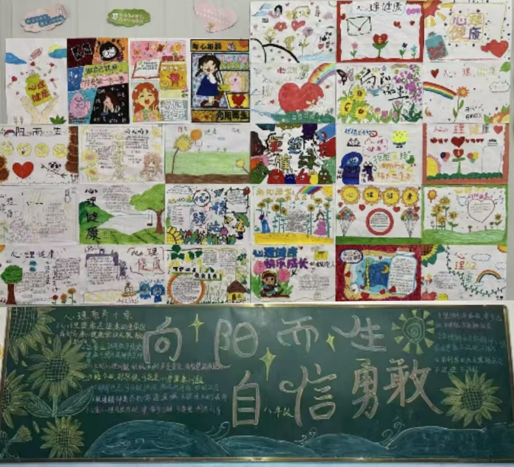 创意表达:绘出心声的“艺术课堂” “心灵绘画”与“心理健康手抄报”活动成为学生表达内心的重要载体,在美术教室,学生们用画笔勾勒出“我的快乐瞬间”——有的画和家人野餐的场景,有的画在篮球场上奔跑的身影;也有学生通过色彩表达情绪,用蓝色渐变表现“从难过到平静”的心理变化。手抄报制作中,学生们精心设计版面,摘抄心理健康名言、绘制心理小漫画、整理情绪调节技巧,七年级学生制作的《心理健康小手册》手抄报,还被评为“最佳创意作品”在校园橱窗展示。此外,各班出版的“心理健康”主题黑板报,以鲜明的主题、丰富的内容,成为校园里一道传递温暖的风景线。