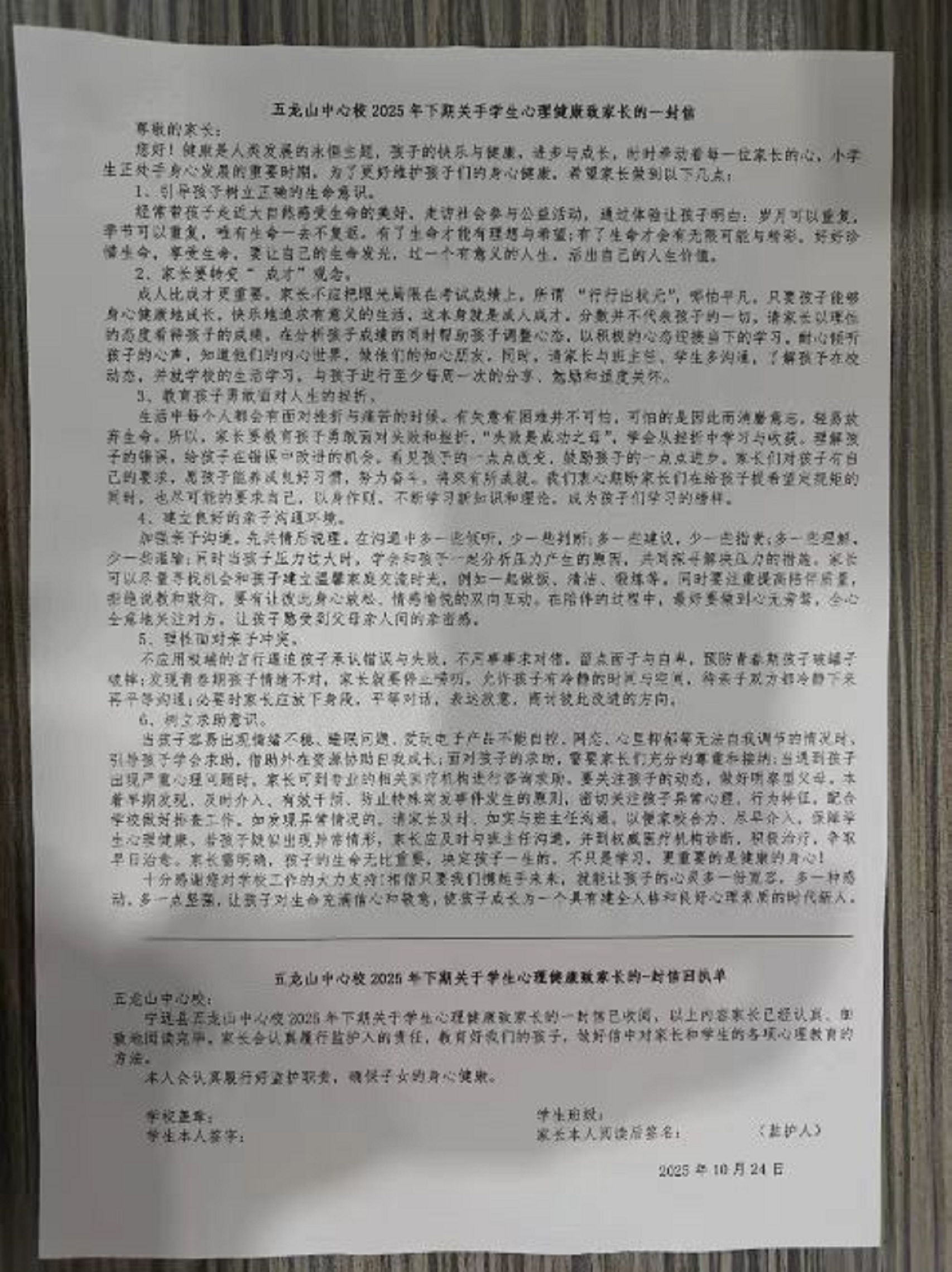 家校联动:共筑防线的“守护课堂” 为凝聚家校共育力量,学校向全体家长发放《五龙山中心校2025年下期关于学生心理健康致家长的一封信》,信中详细介绍青少年心理发展的特点、家长关注孩子心理健康的“五个要点”——多倾听少评判、多鼓励少指责、多陪伴少说教、关注睡眠与运动、发现异常及时求助,同时附上学校心理辅导室联系方式及专业心理援助热线。不少家长收到信后,通过班级群分享感悟:“以前总关注孩子的成绩,忽略了他的情绪变化,这封信提醒我,孩子的心理健康比分数更重要。”部分班级还开展“家长心理沙龙”线上活动,心理教师与家长交流如何营造和谐的家庭氛围,助力孩子心理健康成长。 (编辑:李爱华 责编:邓明平)