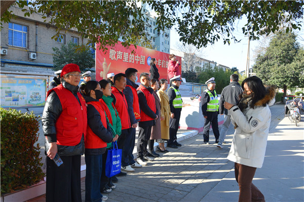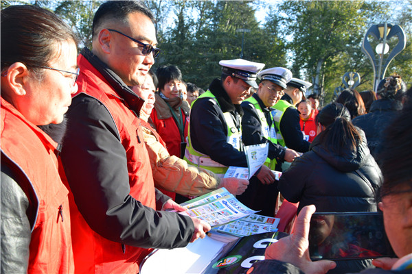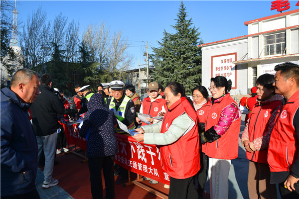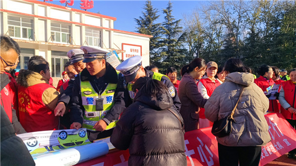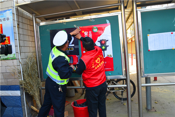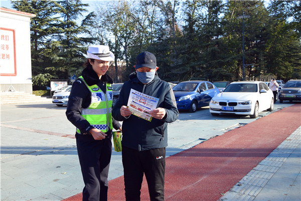 志愿者跟交警一起发放交通宣传单 侯马市交通管理大队宣传科科长郭峰跟志愿者一起在侯马二中粘贴宣传海报 高速四支队3大队杨队长在细致讲解交通法律法规