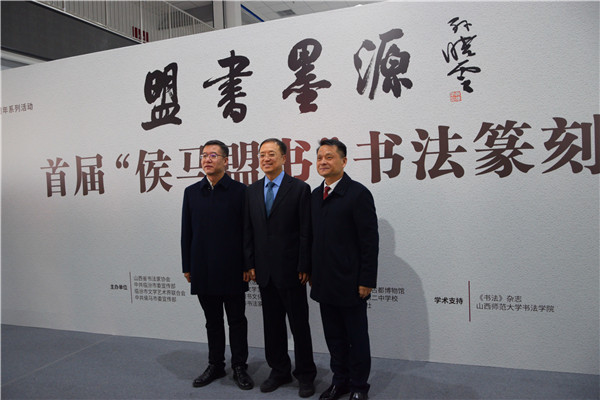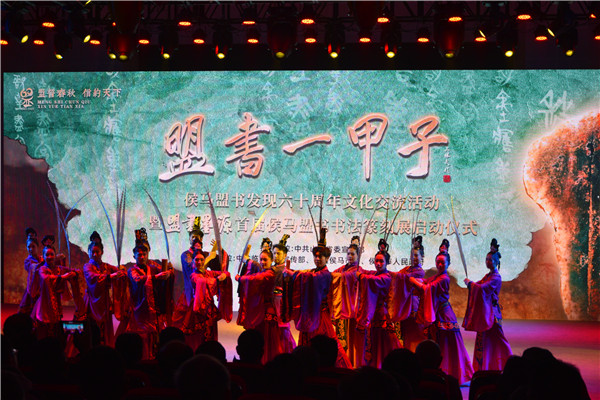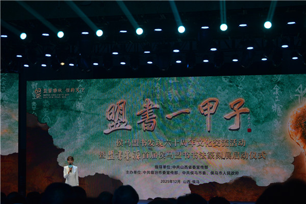 隆重举行侯马盟书发现六十周年文化交流活动暨“盟书墨源”首届侯马书法篆刻展启动仪式 翰墨重温晋国遗珍,金石铭刻甲子春秋 为弘扬中华优秀传统文化,展示书法艺术的独特魅力,推动地域文化繁荣发展,12月9日,“盟书一甲子”侯马盟书发现六十周年文化交流活动暨“盟书墨源”首届侯马盟书书法篆刻展启动仪式在山西省侯马市新二中体育馆隆重举行。 省委宣传部二级巡视员张三忠,省广播电视局党组书记、局长赵晓春,临汾市委常委、秘书长张润泽,山西师范大学党委常委、副校长王小平,山西省文联党组成员、副主席谢振中,山西省书法家协会主席、晋中学院党委副书记薛珠峰,临汾市文联主席元福明,侯马市委书记尹明星等领导参加了启动仪式。 开场舞《铿锵盟誓》在璀璨的灯光下拉开了帷幕,舞者迈着轻盈而富有节奏感的步伐以舒展的肢体语言勾勒出玉圭上的古老誓言,歌曲《千年后的我》、舞蹈《书韵》让观众重现春秋盟誓场景。与会人员共同观看侯马盟书书法篆刻展优秀作品。 本次展览征集到来自海内外2035件作品,最终评审出优秀作品10件,优秀提名作品10件,入展作品99件,展出作品有德高望重的书法名家的匠心之作,也有青年书法家的创新探索,他们的作品以新锐视角独特结构,在笔墨章法中融入时代气息,尽显传统书法的深厚底蕴;让古老的书法艺术焕发出新的生命力。展览汇集省内外书法名家的精品力作,作品涵盖篆、隶、楷、行、草等多种书体,既传承古典精髓,又彰显时代精神,旨在为全市人民及书法爱好者贡献一场高水平的艺术盛宴。