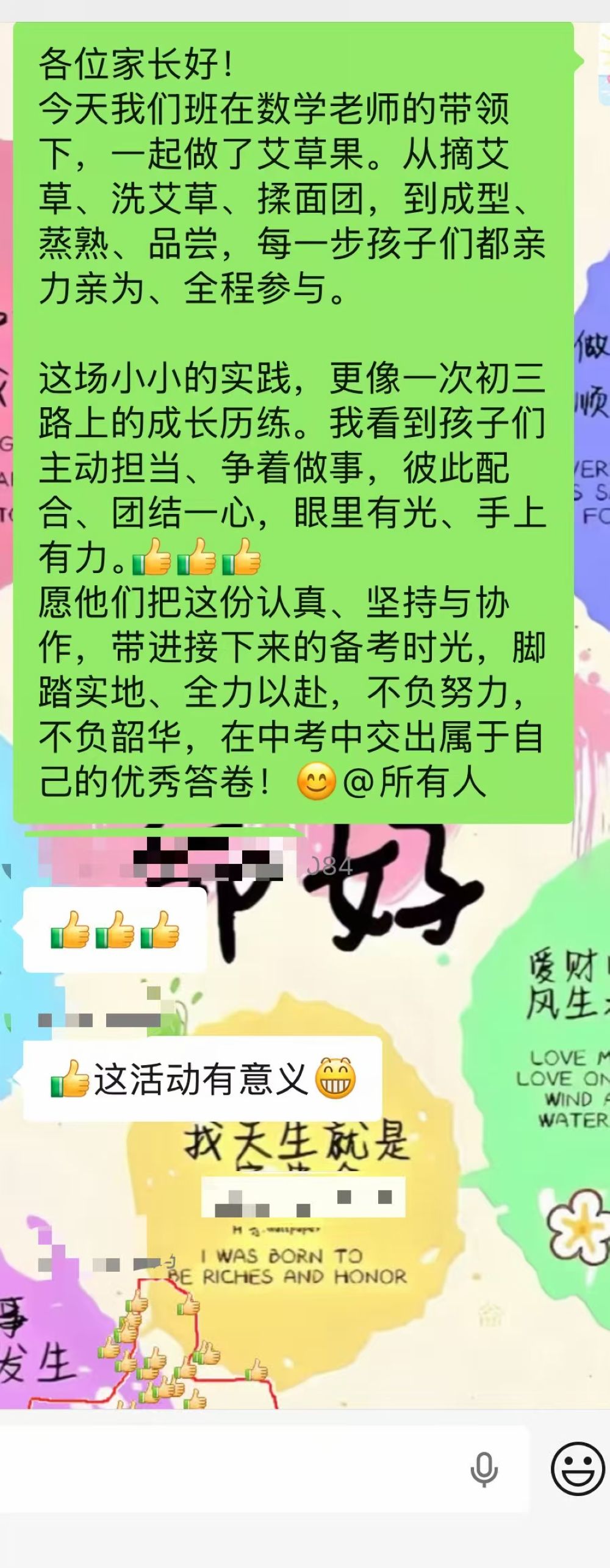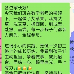 艾香润心 以劳育人万载县马步初中开展青团制作劳动实践活动 本网讯(记者:潘华 通讯员:郭茹茜)为深入落实劳动教育要求,传承中华优秀传统文化,缓解初三学生备考压力,近日,万载县马步初中一班级组织开展“春日寻艾·制作青团”劳动实践活动。 阳光正好,微风不燥。同学们在老师的带领下,提着袋子来到学校菜地,开启了艾草采摘之旅。大家蹲在菜地,仔细辨认着叶片细碎、带着独特清香的艾草,小心翼翼地将鲜嫩的艾尖掐下,放进随身的袋子里。 学生们在清洗、揉面、塑形、蒸制的全过程中,动手实践、合作互助,现场氛围热烈。当有男生看到别的盆里揉出的面团更光滑时,瞬间燃起胜负欲,攥紧手里的面团边揉边喊:“不行,这胜负欲上来了,开干!”看,这就是青春热血! 大家发挥创意,捏制出各式趣味造型青团,在劳动中感受传统民俗魅力,锤炼实践能力。 蒸好的青团带着淡淡的艾草香被端到教室,同学们围在一起,互相递着青团,品尝着自己亲手制作的美食。 大家还将做好的青团精心打包,附上写满祝福的便签,送到了各科老师与校领导的手中,用这份带着春日暖意的礼物,传递着对师长的感恩与敬意。 活动结束后,老师将活动照片与孩子们的成果分享至班级家长群,家长们纷纷留言点赞:“这样的活动太有意义了!” 这些温暖的反馈,不仅是对活动的肯定,更架起了家校共育的桥梁,让校园与家庭的力量同向而行,共同守护孩子们的成长。 此次活动,将劳动教育、传统文化教育与感恩教育深度融合,让学生在实践中体验劳动、热爱劳动,真正实现以劳树德、以劳增智、以劳育美。下一步,我校将持续创新劳动教育形式,丰富育人载体,让劳动之美浸润校园,助力学生全面发展、茁壮成长。 微信扫一扫,阅读更方便^_^ |