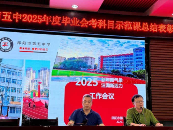 凝心聚力展风采 示范引领促提升 ——邵阳市第五中学2025届初三毕业会考科目示范课表彰总结会圆满举行 本网讯 (通讯员 刘蒋惠子)为深化课堂教学改革,发挥骨干教师示范作用,助力初三毕业会考备考工作,邵阳市第五中学于5月6日隆重举行初三会考科目示范课展示暨表彰总结活动。本次活动以“聚焦核心素养,优化备考策略”为主题,通过示范课展示、经验分享、表彰先进等环节,为全校教师提供了高质量的备考研讨平台。 活动期间,语文、数学、英语、物理、化学、道德与法治、历史等会考学科骨干教师代表进行了精彩纷呈的示范课展示。教师们紧扣新课标要求,结合学情特点,以任务驱动、分层教学、真题精讲等多样化形式,呈现了兼具实效性与创新性的课堂范例。各学科课堂充分体现“以学生为主体”的理念,注重学法指导与分层落实,为初三复习课提供了可借鉴的范式。 示范课结束后,学校召开总结表彰大会。教研室唐洞庭主任对活动进行全面总结,充分肯定了示范教师的专业引领作用,并强调各备课组要结合学科特点,进一步优化“精准教研、分层施策”的备考方案。大会对深耕在一线的初三骨干教师予以表彰。 (教研室主任唐洞庭发表讲话) 唐礼林书记在总结讲话中高度评价此次活动“有深度、有温度、有实效”,并对初三接下来的教学工作寄予了厚望,同时也鼓励了所有青年教师向骨干教师们多取经,多看齐。 (全体初三毕业会考科目示范课上课教师合影) 本次活动的成功举办,不仅展现了邵阳市第五中学教师团队的专业素养,更吹响了2025届初三会考冲刺的号角。全体教师将以此次表彰为动力,以更饱满的热情、更科学的策略,助力学子在毕业会考中勇创佳绩! 一 审: 向 娇 连 二 审: 段 绪 政 审 核: 朱 海 荣