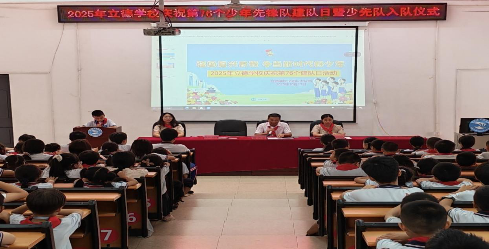 【永州】强国复兴有我 争当新时代好少年 ——宁远县立德学校开展庆祝少先队建队76周年暨新队员入队仪式 中国普法教育在线湖南永州宁远工作站讯:(通讯员:周小玲 黄华军 刘超云)10月13日,值中国少年先锋队建队76周年之际,宁远县立德学校一号报告厅内队旗飘扬,气氛庄重而热烈。学校少先队大队部以“强国复兴有我,争当新时代好少年”为主题,为新队员举行了一场庄严而难忘的入队仪式,学校领导、各班优秀少先队员代表及学生会成员齐聚一堂,共同见证了这一光荣时刻。 仪式在激昂的《义勇军进行曲》中拉开帷幕,全体师生高唱国歌,注视着国旗冉冉升起。在庄严的队歌和出旗仪式后大队辅导员周小玲宣读了新队员名单,并由优秀少先队员为新队员佩戴上鲜艳的红领巾。在优秀少先队员代表的带领下,新队员们面向队旗,高举右拳,进行了庄严的入队宣誓。 仪式上,学校党支部宣传委员、德育副校长黄华军为新队员们送上寄语。他强调了红领巾的荣誉与责任,并希望队员们立志向、勤学习、修品德,努力成长为担当民族复兴大任的时代新人。最后,在大队辅导员的带领下,全体队员铿锵呼号,“时刻准备着”的誓言响彻会场。 此次建队日活动,不仅为宁远县立德学校少先队组织增添了新鲜血液,也让全体少先队员接受了一次深刻的爱国主义教育和革命传统教育。相信在星星火炬的照耀下,宁远县立德学校的少先队员们将携手共进、共同努力,让红领巾在新时代的阳光下更加鲜艳夺目。 (编辑:李爱华 责编:邓明平)