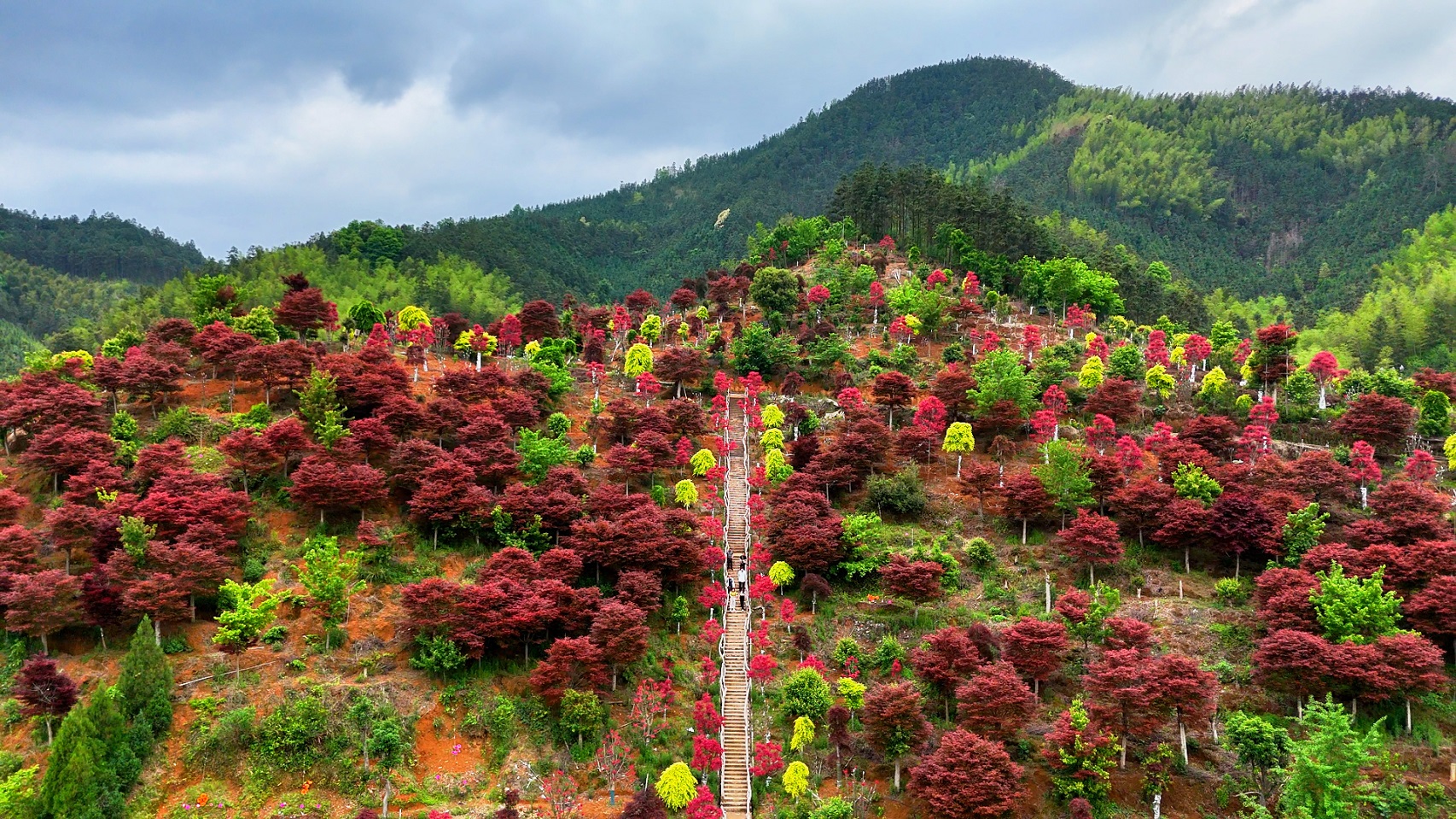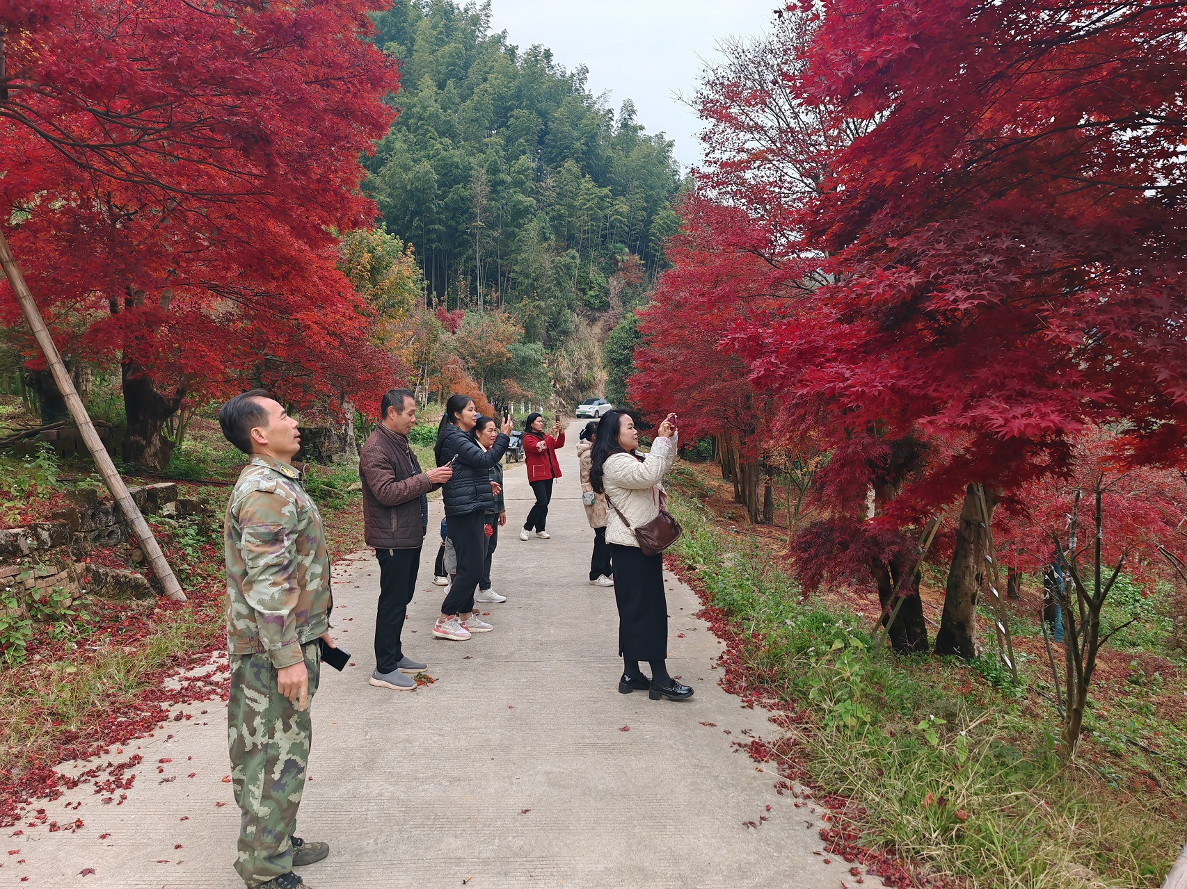 中国普法教育在线广西全州讯(通讯员:邓琳) 近年来,全州县咸水镇大力发展红枫产业,通过农文旅融合发展,绘就一幅乡村振兴新画卷。 眼下,全州县咸水镇的枫叶迎来最佳观赏期,层林尽染的红枫不仅勾勒出乡村的诗意画卷,更成为带动当地文旅融合、赋能乡村振兴的生动注脚。12月4日,全州县咸水镇蕉川村红枫种植基地,连片枫林中的枫叶在阳光映照下层层叠叠,深红、橙红、金黄交织错落,宛如打翻了大自然的调色盘,吸引众多游客纷至沓来。来自湖南的游客蒋先生说:“蕉川的这个红枫确实很漂亮,今天特意跟朋友一起来看一下,感到心旷神怡。” 据了解,全州县咸水镇红枫种植面积达8000亩,总产值达3.6亿元。其中蕉川村种植2000余亩,拥有红小袖等60余个红枫品种。通过嫁接改良技术培育的红枫品质优良,产品远销云南、广东、浙江等全国各地,直接带动种植农户每户年均增收5000元以上,实现了生态效益、经济效益和社会效益多赢。