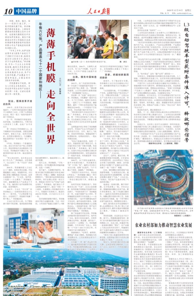 年售六亿张,产品覆盖七十二个国家和地区—— 薄薄手机膜 走向全世界 本报记者 申智林 《人民日报海外版》(2025年12月19日 第 10 版) 李洪梅(左一)向非洲客商介绍自家产品 (陈 杰摄) 李洪梅(中)在指导员工加工手机膜 (陈 杰摄) 切割、清洗、抛光、贴合……经历21道工序,一张手机钢化膜下线,李洪梅随手拿起包装盒,上面绘有黄黑相间的图案以及外文字母。这张钢化膜将发往中亚国家哈萨克斯坦,离位于湖南省永州市江华瑶族自治县的湖南明意湖智能科技股份有限公司生产基地直线距离约4000公里。 “今年上半年,哈萨克斯坦等中亚5国客户给我们下了2000万片的订单,陆续完成交付1200多万片,剩余几百万片也即将发运。”李洪梅说。作为一个土生土长的瑶族姑娘,她创立并执掌这家企业,与家人创立的几家企业形成集团化企业,年产6亿张手机膜,产品覆盖72个国家和地区,占据全球约30%的市场份额。 手机膜看似不起眼,却与人们的生活息息相关。为何这家中国企业的产品能走向世界?日前,记者走进湖南江华一探究竟。 创业,搭乘改革开放的东风 1995年,改革开放正如火如荼地进行。广东等中国沿海省份已建成不少成熟的工业区,汇聚了众多制造业企业,吸引一批又一批的内陆青年南下寻找机会。 这一年,李洪梅因为家庭变故、经济受挫,无法继续学业,不得不加入滚滚务工人潮,远赴广东寻求生计。 第一次走出江华的重重大山,这个刚刚初中毕业的姑娘,亲眼见到现代城市,紧张又兴奋。虽然历经挫折,但凭借乐观和努力,几经辗转,她还是顺利在广东东莞的一家工厂扎下根。 5年间,李洪梅从一个普通的打工妹,成长为车间乃至产线上的管理人员。周边同事每天谈论眼前的工作与生活,李洪梅却并不满足于此,看着周围环境日新月异,她也想抓住机会。 “我父亲在世时,是乡里企业办的工作人员。”李洪梅说,言传身教下,自己也有了一些“不安分”的商业想法。 2000年,李洪梅和爱人王永红从工厂离职,来到东莞长安镇,开始摆地摊卖小商品。短短数年间,夫妇俩从零售小摊贩做成了批发商,还将生意做到广州。“打火机、指甲钳、小电器……什么都卖。”李洪梅说。当时,最新潮的电子产品莫过于手机,于是,她的档口也开始销售手机皮套、挂饰等配件。 2005年,王永红“斥巨资”给李洪梅送上一份特别珍贵的生日礼物——一部手机。“只记得屏幕不是很大,生怕刮花了,我抱着手机睡了两个晚上。”李洪梅回忆。 王永红又好笑又心疼,为了帮助妻子保护手机屏幕,他用捡到的带黏性的透明塑料片,裁成屏幕大小,做成手机膜。 高兴之余,李洪梅想,“手机一定会普及,对手机膜的需求将越来越多,这是一个商机。” 说干就干。夫妻俩仔细研究,发现当时做手机膜的最好材料是PET(聚对苯二甲酸乙二醇酯)制成的透明塑料片。“那时国内还很难找到这种材料,我们在佛山找到一些从日本、韩国进口的用于生产其他产品的边角料。”李洪梅说,他们拿出几乎全部现金积蓄买下,就在广州的一个小屋里,夫妻俩加上李洪梅的母亲3个人,用裁照片的相纸刀,做成约2000张手机膜,合计成本2元左右一张。 经历短暂的销售不顺后,李洪梅迎来手机行业蓬勃发展。不过一年时间,小作坊的产能就已经跟不上不断增长的需求,2006年,夫妻两人成立公司,专门生产手机膜。不过2年时间,公司年产销能力就提升到1000多万张。 出海,擦亮中国制造的招牌 2003年,在广州进货的李洪梅,第一次见到了大批量的海外客商——这在东莞产线上难得一见。“那时候我就想,以后我也要将生意做到海外。”李洪梅暗暗下定决心。 然而第一次“出海”却是无奈之举。李洪梅说,手机膜曾一度卖不出去。为了打开局面,她想尽各种办法,一连找了几十个外国客商。磨破嘴皮,最终一个阿尔及利亚的客户勉强批发走500张,一个印度客户买走100张,其余的就只能半卖半送了。 “那时候对国外市场没有任何了解。”李洪梅说。多年以后她才知道,第一个阿尔及利亚客户之所以采购,完全是被自己的诚心打动,手机在彼时的阿尔及利亚同样是新鲜事物。 这两笔海外的订单给了李洪梅错误信号,并因此产生全力开拓海外市场的盲目自信。当年,她买上飞机票,首选非洲和南亚,想着起码把飞机票挣回来,结果铩羽而归,一笔业务都没谈成。 “但也不是毫无收获,每到一个地方,我就给别人留下联系方式,告诉他们我在中国广州做手机膜,欢迎实地考察。”李洪梅说,接下来两年,在国内手机业务的爆发式增长带动手机膜销售的同时,居然也陆续来了一些海外客商,有些就是第一次出国时接洽成功的。 2008年,由于国际金融危机,海外市场需求减少,李洪梅却在“危”中寻找“机”。她把公司交给王永红打理,密集飞往海外。“2个月跑4个国家,连轴转。”李洪梅说。 “别看我只有初中毕业,我会说6种语言。”李洪梅随口蹦出一串印地语和几个阿拉伯语短句。当然,每一种语言都会得不多,够做生意就好。 如何开拓客户和稳住客户,李洪梅有自己的“巧思”。在办公室里摆着一张李洪梅手持滑盖手机接听电话的照片。“年轻时的样子!”李洪梅羞涩一笑,在海外推销产品小样时,李洪梅就把这张照片印在包装上——这有两重目的:一是早年间跨境电商并不发达时,海外客商到中国来,对着照片就可以精准地找到她本人以及她的企业;二是给海外客商一种产