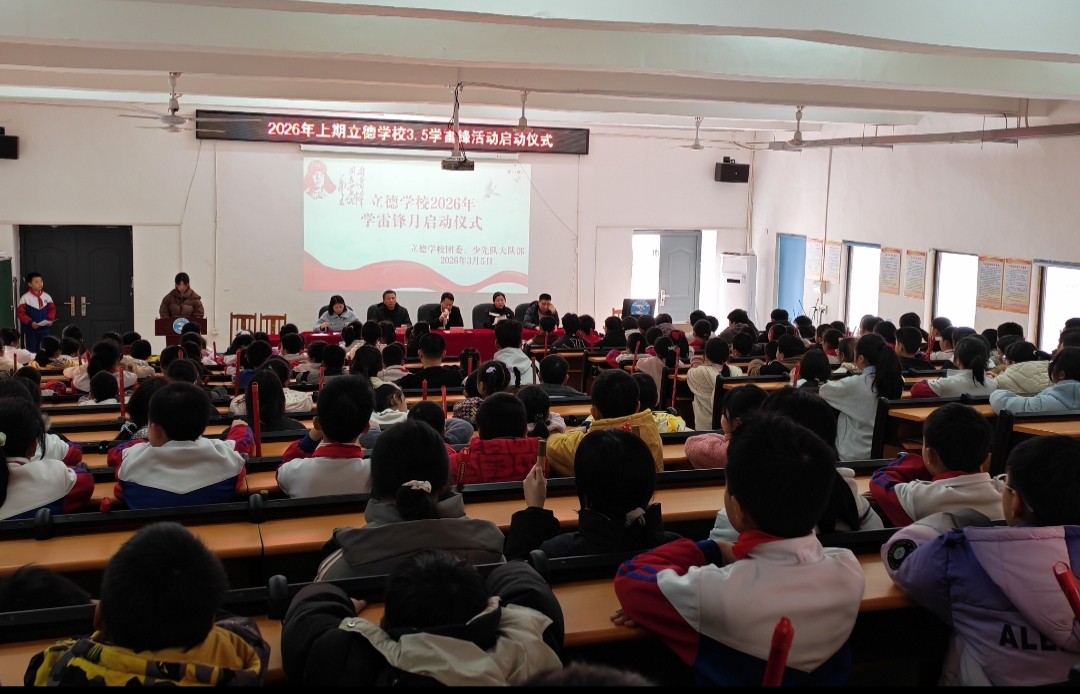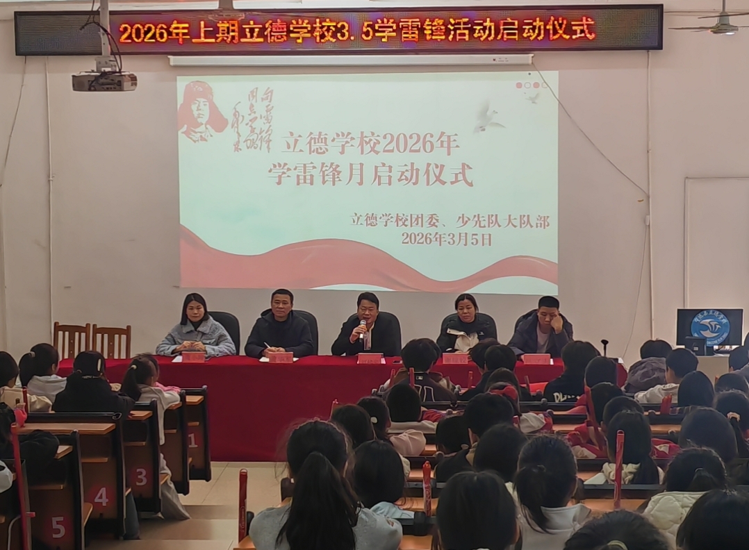 三月春“锋”暖 薪火代代传 ——宁远县立德学校举行2026年学雷锋月启动仪式 中国普法教育在线湖南永州讯:(通讯员:周小玲 黄华军 刘超云)春风拂校园,薪火永相传。在第63个学雷锋纪念日到来之际,3月5日,宁远县立德学校在一号报告厅举行2026年“3·5学雷锋”活动月启动仪式。学校领导、学生会成员、各班班长及优秀少先队员代表齐聚一堂,共赴一场精神之约,让雷锋精神在校园落地生根。 仪式在雄壮的国歌声中拉开帷幕。首先,学校党支部书记、校长刘超云作动员讲话,他深刻阐释雷锋精神的时代内涵,结合中小学生成长实际,号召全体同学从身边小事做起,在日常学习生活中践行助人为乐、爱岗敬业、勤俭节约的优良品格,把雷锋精神内化于心、外化于行。接着,德育党支部宣传委员、副校长黄华军介绍了本月学雷锋系列活动安排,学校将以主题班队会、志愿服务、实践体验等形式,推动学雷锋活动常态化、多样化,引导学生在实践中感悟精神、锤炼品格,争做向上向善好少年。紧接着,少先队大队辅导员宣读《弘扬雷锋精神,争做时代新人》倡议书,鼓励同学们积极投身志愿服务,从点滴善举做起,让雷锋精神在校园内外闪光。学生代表与红领巾讲解员生动讲述雷锋故事,带领大家重温榜样事迹,汲取奋进力量。 在学生会主席张泽坤带领下,全体同学高举右手庄严宣誓,誓言铿锵,彰显新时代少年立志向学、崇德向善的坚定决心。随后,全体师生齐唱《学习雷锋好榜样》,嘹亮歌声传递向雷锋同志学习的赤诚与担当。最后,全体学生依次在“传承雷锋精神 争做时代新人”横幅上郑重签名,一笔一画写下承诺, 让雷锋精神在传承中焕发新的生机。 此次启动仪式,既是学雷锋系列活动的正式开篇,也是一次深刻的精神洗礼与信仰传承。宁远县立德学校将以此次活动为契机,持续推动学雷锋活动融入日常、化作经常,引导学子以点滴善举汇聚温暖洪流,用青春与担当书写新时代雷锋故事,让雷锋精神在立德树人的校园里生生不息、薪火相传。 (编辑:唐泽平 责编:邓明平)