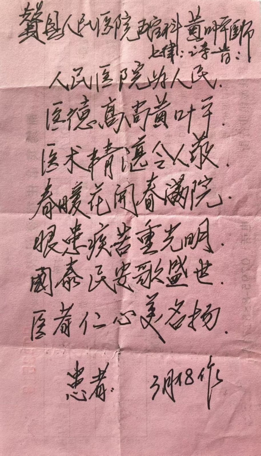 暖心医患故事|眼科:妙手复光明,书信寄真情 本网讯(记者:潘华 通讯员:谌燕)在宜春学院第一附属医院 万载县人民医院眼科的日常诊疗中,一段医患之间的温暖故事悄然上演,用信任与感恩,书写着最动人的医者温情。 一位老年白内障患者,术前右眼视力极差,仅能分辨指数,视物模糊不清,日常起居与出行都备受影响,生活质量大打折扣。饱受视力困扰的他,怀着对光明的期盼,来到眼科寻求帮助。 科室团队高度重视,为老人进行全面细致的检查,精准评估病情,量身制定安全高效的手术方案。凭借精湛的眼科技术与严谨负责的态度,手术顺利完成。术后一周复查,老人右眼视力从术前仅存光感、分辨指数,成功恢复至0.8,清晰的世界重新回到眼前。 重获光明的老人激动不已,为表达心中最诚挚的谢意,特意送来一面写有“妙手回春 医德高尚”的锦旗,同时亲笔写下感谢信,字里行间满是对医护团队专业医术的认可、贴心服务的感激。一面锦旗、一封书信,不仅是患者的认可,更是医患之间最真挚的情感联结。 从术前耐心沟通安抚,到术中精准操作,再到术后细致随访,眼科始终以匠心守初心,以仁心护光明。用专业守护清晰“视”界,用温暖传递医者担当,让每一位患者都能告别模糊,重享清晰生活,让信任与温暖在医患之间长久传递。 科室简介 宜春学院第一附属医院 万载县人民医院眼科是全县眼科诊疗中心、宜春市重点学科、江西省眼科疾病临床医学研究中心及江西省眼科专科联盟成员,有副主任医师3人,主治医师1人,高年资住院医师2人,副主任护师2人,主管护师4人,护师3人,设置病床28张,年门诊工作量1万余人次,住院病人约1000人次/年,手术约700例。医生曾选派至北京、长沙、南昌等多家全国知名三甲医院进修学习,业务精湛,奋发向上,竭诚为广大患友提供更优质的医疗服务。拥有高端设备:德国进口蔡司5000眼科OCT、美国进口白内障Intuitiv超声乳化仪、IOL master生物测量仪、日本进口拓普康眼底造影仪、欧视博眼底照相机、德国蔡司手术显微镜、康华眼科A/B超、角膜曲率仪、日本进口拓普康验光机、裂隙灯照相机、日本进口尼德克非接触眼压计、直接检眼镜、双目间接检眼镜等设备。开展手术:青光眼复合式小梁切除术、白内障超声乳化联合人工晶体植入术、玻璃体腔药物注射术、泪囊炎微创经鼻内镜泪囊鼻腔术、翼状胬肉切除术联合角膜缘干细胞移植术、眼底血管造影术、睑内翻矫正术、睑外翻矫正术、重睑手术、眼睑肿物切除术、眼眶肿物切除术等手术。 科室地址:门诊二楼眼科、耳鼻咽喉科诊室,住院大楼6楼新区眼科、耳鼻咽喉科住院部。科室电话:0795-8981156 微信扫一扫,阅读更方便^_^ |
