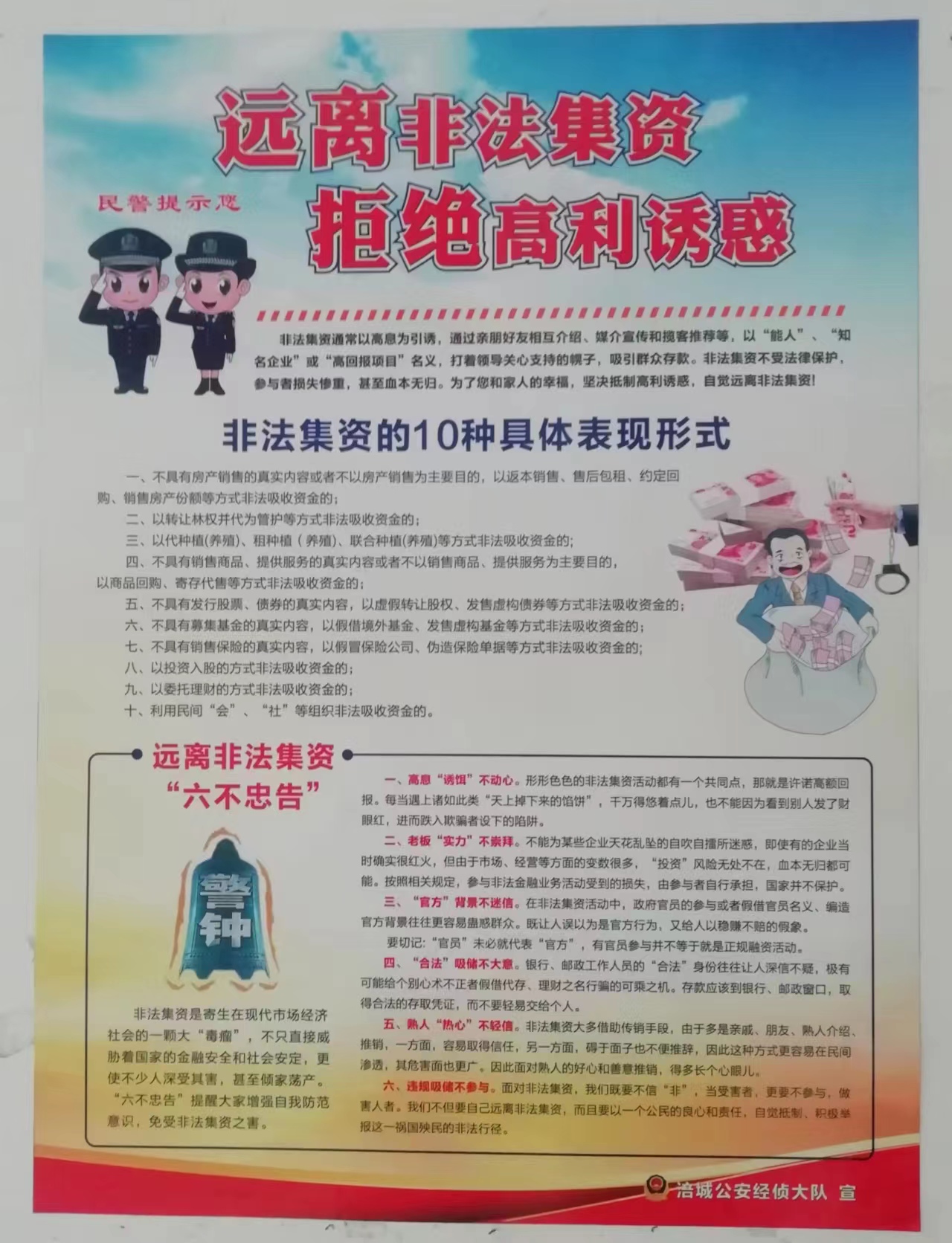 参与者损失惨重,甚至血本无归。 民警提示您: 为了您和家人的幸福,坚决抵制高利诱惑,自觉远商非法集资! 非法集资的10种具体表现形式: 一、不具有房产销售的真实内容或者不以房产销售为主要目的,以返本销售、售后包租、约定回购、销售房产份额等方式非法吸收资金的; 二、以转让林权并代为管护等方式非法吸收资金的; 三、以代种植(养殖)、租种植(养殖)、联合种植(养殖)等方式非法吸收资金的; 四、不具有销售商品、提供服务的真实内容或者不以销售商品、提供服务为主要目的,以商品回购、寄存代售等方式非法吸收资金的: 五、不具有发行股票、债券的真实内容,以虚假转让股权、发售虚构债券等方式非法吸收资金的; 六、不具有募集基金的真实内容,以假借境外基金、发售虚构基金等方式非法吸收资金的; 七、不具有销售保险的真实内容,以假冒保险公司、伪造保险单据等方式非法吸收资金的; 八、以投资入股的方式非法吸收资金的; 九、以委托理财的方式非法吸收资金的; 十、利用民间“会" 、“社”等组织非法吸收资金的。 ——警钟—— 非法集资是寄生在现代市场经济社会的一颗大“毒瘤”,不只直接威胁着国家的金融安全和社会安定,更使不少人深受其害,甚至倾家荡产。“六不忠告”提醒大家增强自我防范意识,免受非法集资之害。 远离非法集资“六不忠告” 一、高息“诱饵”不动心。形形色色的非法集资活动都有一个共同点,那就是许诺高额回报。每当遇上诸如此类“天上掉下来的馅饼”,千万得悠着点儿,也不能因为看到别人发了财眼红,进而跌入欺骗者设下的陷阱。 二、者板“实力”不崇拜。不能为某些企业天花乱坠的自吹自擂所迷感,即使有的企业当 时确实很红火,但由于市场、经营等方面的变数很多,“投资”风险无处不在,血本无归都可 能。按照相关规定,参与非法金融业务活动受到的损失,由参与者自行承担,国家并不保护。 三、“官方”背景不迷信。在非法集资活动中,政府官员的参与或者假借官员名义、编造官方背景往往更容易蛊感群众。既让人误以为是官方行为,又给人以稳赚不赔的假象。 要切记: “官员”未必就代表“官方”,有官员参与并不等于就是正规融资活动。 四、“合法”吸储不大意。银行、邮政工作人员的“合法”身份往往让人深信不疑,极有可能给个别心术不正者假借代存、理财之名行骗的可乘之机。存款应该到银行、邮政窗口,取得合法的存取凭证,而不要轻易交给个人。 五、熟人“热心”不轻信。非法集资大多借助传销手段,由于多是亲戚、朋友、熟人介绍、推销,一方面,容易取得信任,另一方面,碍于面子也不便推辞,因此这种方式更容易在民间渗透,其危害面也更广。因此面对熟人的好心和善意推销,得多长个心眼儿。 六、违规吸储不参与。面对非法集资,我们既要不信“非”,当受害者,更要不参与,做害人者。我们不但要自己远离非法集资,而且要以一个公民的良心和责任,自觉抵制、积极举报这一祸国殃民的非法行径。 (作者系中国普法教育在线网四川省绵阳市涪城区普法工作站站长) 微信扫一扫,阅读更方便^_^ |