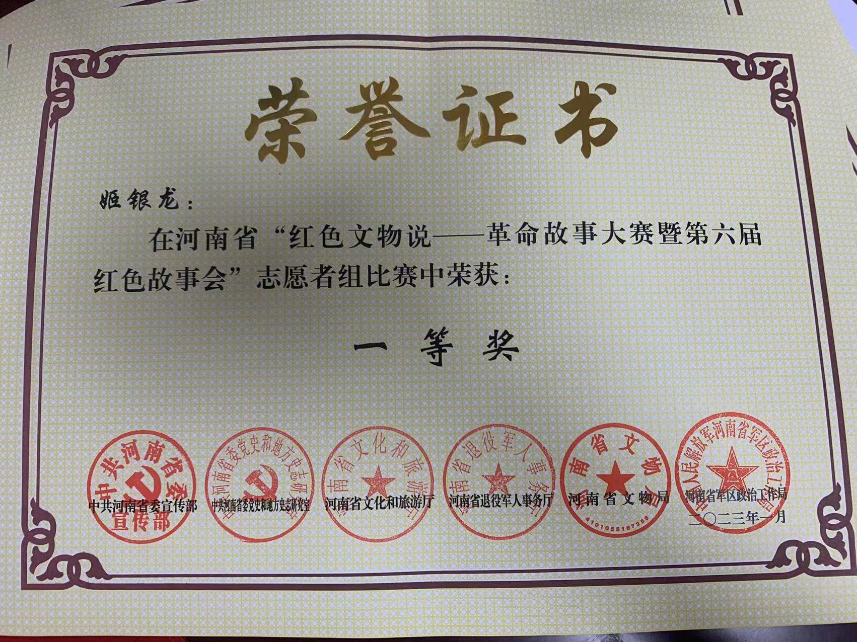 中国普法教育在线网河南讯(丁雪深) 近日.由中共河南省委宣传部,河南省委党史和地方史志研究室,河南省文化和旅游厅,河南省退役军人事务厅,河南省军区政治工作局联合举办的河南省“红色文物说——革命故事大赛”暨红色故事会取得圆满成功,获奖名单和获奖个人也随即公布。 据了解:本次大赛是为了全面贯彻党的二十大精神,落实习近平总书记关于革命文物工作的重要指示和考察安阳重要讲话精神。积极开展“红色耀中原”主题宣传教育实践活动,深入实施“行走河南,读懂中国”文旅文创融合战略。进一步加强红色故事讲解员队伍建设,传承红色基因,赓续红色血脉。 商丘市永城省级非遗莲花落代表性传承人姬银龙和他的原创作品《彭雪枫护牛》获得了志愿者组一等奖。姬银龙是河南省省级非物质文化遗产姬派莲花落传承人。著名相声表演艺术家侯耀华大师的亲传弟子,参加过央视《黄金100秒》等节目。  姬银龙老师演技优秀,唱功脱凡,早在上世纪末就已成为家喻户晓的群众新星,他走遍豫鲁苏皖大地,奋斗二十载,就是为了传承姬派莲花落,丰富基层人民群众的文化生活。 《彭雪枫护牛》是姬银龙根据真实红色历史故事,用莲花落的表现形式,经过加工创作的原创作品。深受百姓喜爱,把红色故事传遍千家万户,为传承红色经典,激励人们为建设社会主义现代化强国团结奋斗,鼓舞了人心,开拓了视野。 让我们以这次大赛为新的起点,不忘初心,砥砺前行,艰苦奋斗,守正创新。以古老文明璀璨的中原文化为根基,讲好中原故事,传承好红色文化,紧跟时代步伐,坚决拥护党的领导,积极服务人民群众。生在华夏,无限光荣,在人类文明进步的浩渺大道上,阔步直前。