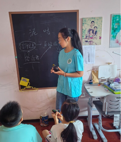 图为实践队在向留守儿童讲解泥咕咕。本网通讯员王艺琳摄。