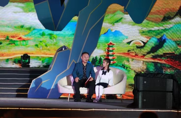 大会现场,国家一级演员邵峰牵着小女孩为现场观众和广大网友讲述了出彩郏县人的故事。