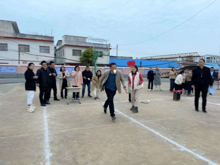 第三个游戏,是夹气球赛跑。马校长和李书记,率先垂范,给大家做了好榜样。