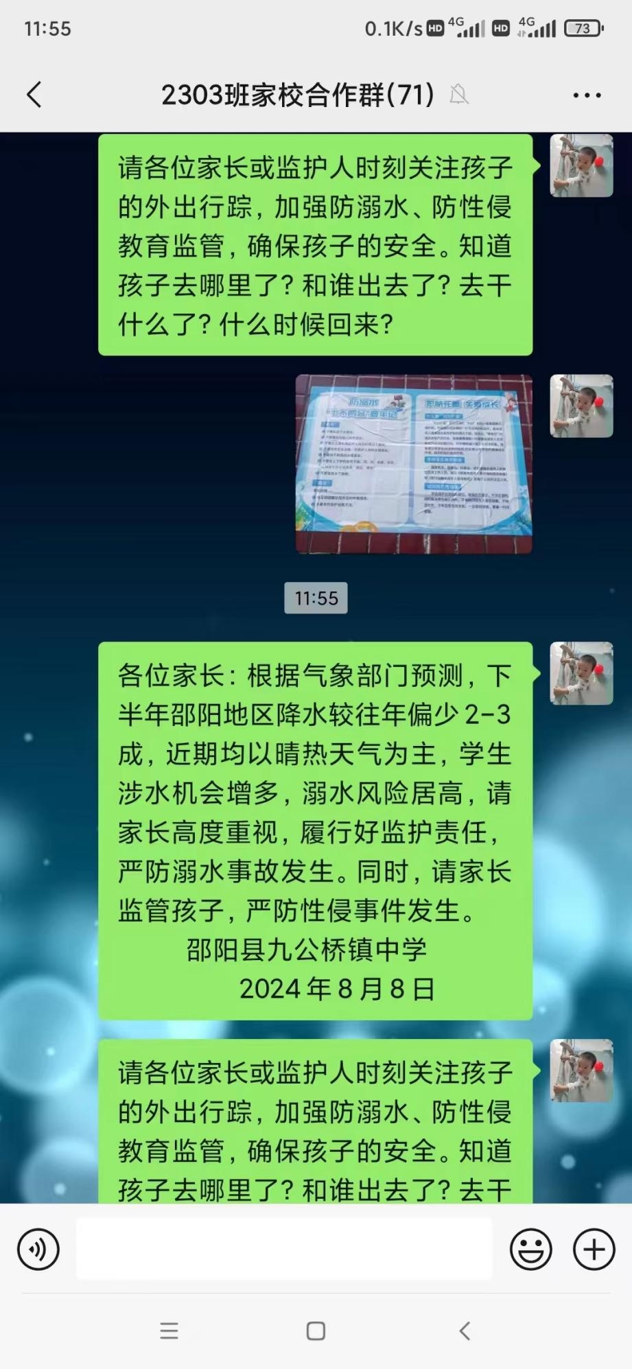 本网湖南讯(黄明国 通讯员:伍乐平)为杜绝溺水事故发生,切实保障学生生命安全,邵阳县九公桥镇中学按照上级要求,扎实做好2024年暑期安全工作,通过标语、宣传栏、微信提醒、电话、千师访万户等方式,落实《湖南省预防中小学生溺水若干规定》普法宣传。 放假前,学校组织开展了“暑假安全不放假”的主题班会课,进一步提高学生安全意识。 为了让《湖南省预防中小学生溺水若干规定》家喻户晓、人人皆知,我校在陆俊杰校长的安排部署和全体行政人员的带领下,全体教师参与,从7月2日至7月10日开展“千师访万户”防溺水防性侵家访,普及“七不两会”知识,提醒家长(监护人)做到常教育、多陪伴、有监督,对孩子行踪要“四知道”,督促家长(监护人)履行监护责任,严防溺水事故和性侵事件的发生。 假期中,根据九公桥镇中心学校的安排,以班为单位组织引导家长通过关注“快乐看”公众号,在“防溺水”专题栏自愿收看芒果TV制作的《湖南省预防中小学生溺水若干规定》宣传视频及防溺水专题课,帮助学生巩固防溺水安全知识;及时发送提醒信息,强化家长监管责任。 九公桥镇中学“暑假安全不放假”,家校联动,为防止溺水事故和性侵事件的发生,提供好了更有效地保障。(编辑:张芳玲)