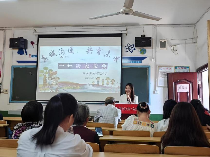 家校携手,筑梦未来 ----牛马司第一完全小学2024年秋季一年级家长会 本网讯(朱海荣 通讯员 孙婷)教育是一场爱与信任的双向奔赴,是家校之间的同心同行。为构建良好的家校沟通桥梁,形成齐抓共管教育合力,创建良好的育人氛围,同时,增强家庭教育意识,掌握科学的家庭教育方法。9月23日上午,牛马司一完小在多媒体教室统筹召开新学期一年级家长会。 双向奔赴,同心同行 带着期许,怀揣着信任,家长们如约而至。老师们和学生志愿者用一声声温馨的问候,组织家长们,依次前往多媒体教室,在爱与期待中有序签到。一场真诚而美好的聚会,一次心与心的交流即将开始。 领导致辞,共筑未来 会议由教导室彭冬田主任主持,彭主任首先表示诚挚的感谢,并阐述家长对孩子的期望和老师的期待,说明教育是一场美好的双向奔赴。 随后,由李校长代表学校向各位家长致辞,这一次李校长的主题是“为了孩子的一切,一切为了孩子”。她先向家长们分享了学校在2023至2024年教育教学中获得的荣誉;再者提出了孩子的成长需要老师、学校以及家长的共同努力与协作并且强调了孩子习惯养成的重要性。李校长在这次的家长会上着重指出了“四个关注三个要”。四个关注:1、关注孩子上课的倾听习惯,主动联系老师;2、关注孩子的思考习惯;3、关注养成孩子的读书习惯,增强孩子的课外阅读能力;4、关注养成孩子良好的作业习惯。三个要:1、要有坚定的态度;2、要以身作则、言传身教;3、要善于发现孩子身上的闪光点。最后李校长还强调了生命高于一切和安全教育的重要性,对于防溺水、防性侵和交通饮食安全等方面都做出了相关阐述。