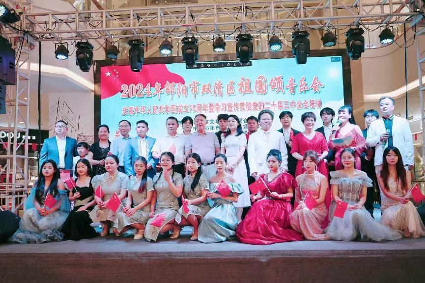 本网讯(朱海荣 通讯员 艾哲 彭艳慧 实习生 李佳暄)9月30日晚,一场由双清区文学艺术界联合会主办、由双清区音乐舞蹈家协会承办的双清区庆祝中华人民共和国成立75周年暨学习宣传贯彻党的二十届三中全会精神祖国颂音乐会在市区友阿商场举行。 音乐会在开场歌舞《节日欢歌》中拉开帷幕。来自邵阳学院音乐舞蹈学院副教授刘莉朋、周劲飚的学生们分别登台展示自己的风采,他们表演的《我把太阳迎进祖国》《追寻》、四重唱《领航》、独唱《我的情歌》《映山红》、四重唱《西湖春晓》《四季歌》《嘉陵江上》、小组唱《游击队歌》等节目精彩纷呈。