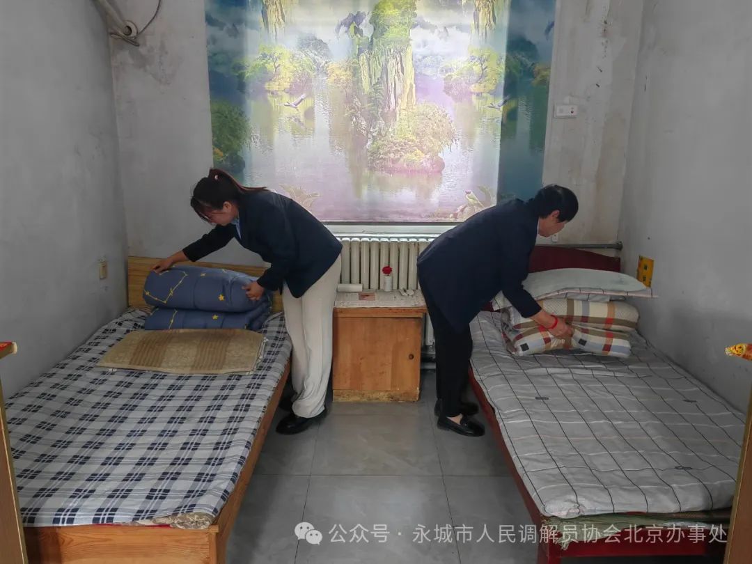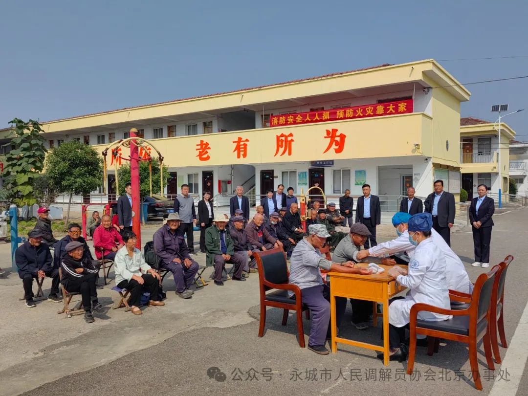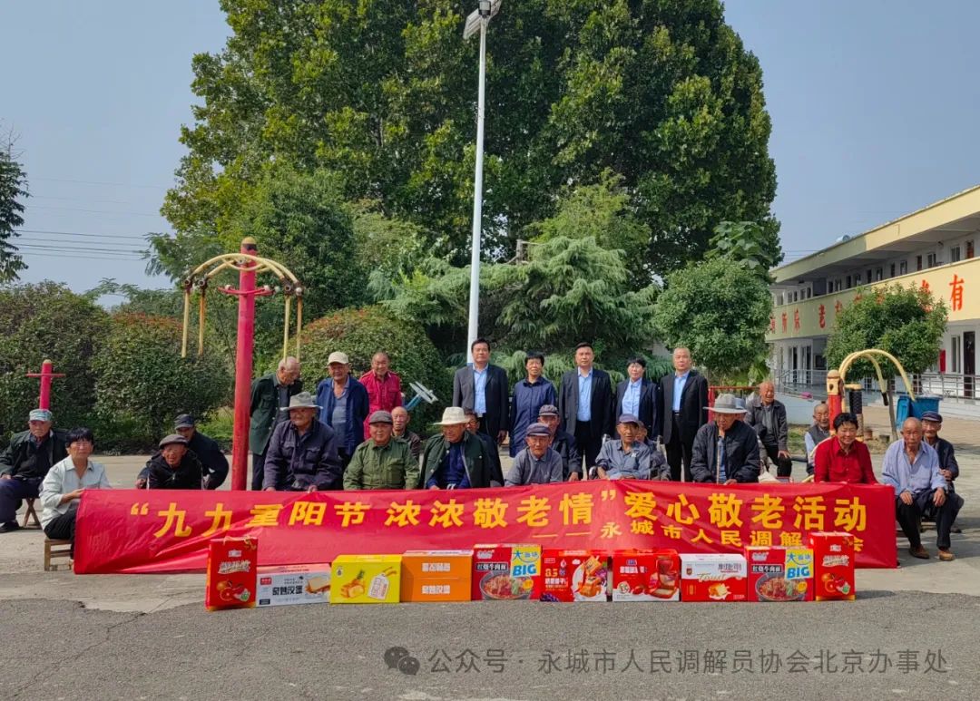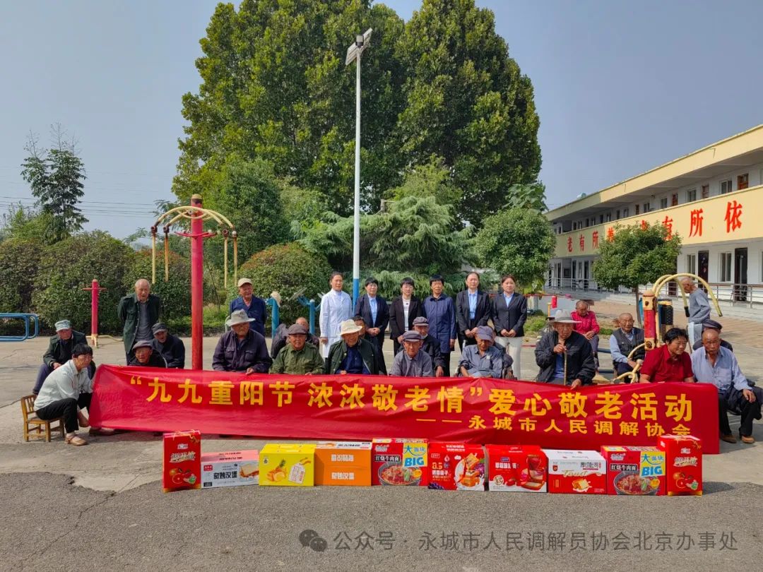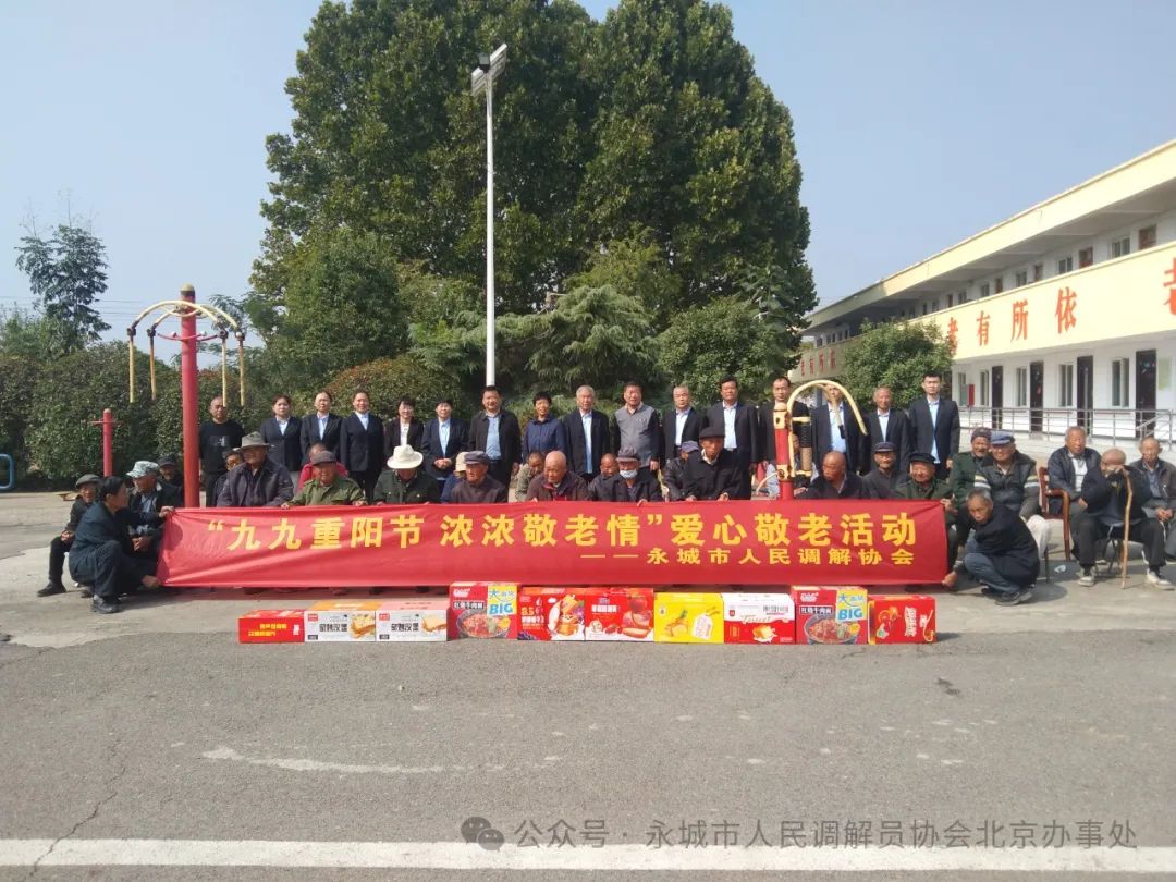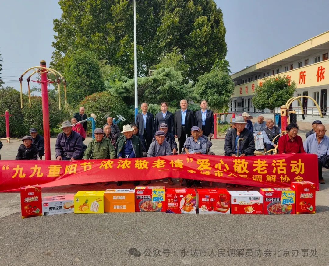 九九重阳节 浓浓敬老情 ——河南省永城市人民调解员协会慰问高庄镇敬老院 图一:河南省永城市人民调解员协会,在永城市委大门对面的人民广场整装待发,准备去高庄镇敬老院慰问老人。 本网讯(记者 陈晔 丁雪深)人间百善孝为先,重阳敬老情意浓。为让老年人有归属感和幸福感。2024年10月9日上午,时值重阳佳节来临之际,永城市人民调解员协会会长陈学海,带领协会领导班子成员及会员代表,带着协会105位调解员和40余位特聘调解员的浓浓敬老爱老之情,走进高庄镇敬老院,为全院44位老人送去真诚关怀和温暖。陈会长一行受到高庄镇党委书记蒋靖山、镇长赵贺、副镇长夏春华、民政所长潘效杰等领导的热情接待。 图二:永城市人民调解员协会会长陈学海一行,与早早在高庄镇政府大门口等候的,高庄镇副镇长夏春华、民政所长潘效杰合影留念。 九九重阳节,浓浓敬老情。永城市人民调解员协会会长陈学海,永城市妇联会原主席、永调协副会长张菊玲,永城市社会组织党工委委员、办公室主任李建设,协会党支部书记孟波波,协会副会长孟宪朋、刘英、王帅,协会工会主席、妇联会主席、办公室主任陈晔,协会党支部、工会、妇联会领导刘举峰、张兴民、潘秋分、王丽、姜辉等一行十余人,参与了以“九九重阳节 浓浓敬老情”为主题的公益活动。与敬老院老人们共度重阳佳节,为老人们送去重阳佳节的祝福。会员们以爱心之举给夕阳送暖,祝老人们延年益寿颐养天年。 图三:永城市高庄镇党委书记蒋靖山、副镇长夏春华、民政所长潘效杰等领导,热情欢迎陈学海会长一行来高庄镇敬老院慰问老人,并与院民们合影留念。 真诚敬老心,一片挚爱情。为搞好此次慰问活动,让老人们度过一个欢乐祥和的节日,让老人们切实感受到温暖和关怀之情,永城市人民调解员协会进行了充分的精心准备。购买了丰盛的节日慰问物品,不但有菠萝面包、红烧牛肉面、汇源果汁、奶香提子、草莓吐司等营养食品,还给老人们送去强身健体的滋补美酒。 图四:永城市人民调解员协会党支部书记孟波波及协会党员代表,与院民们合影留念。 爱心献给夕阳红,亲切慰问倾真情。在敬老院慰问活动中,永城市人民调解员协会成员们,与院民们进行了友好交流,倾注了真诚关爱。协会副会长张菊玲认真了解了院民们,在饮食、起居、医疗等方面的具体情况;永城市社会组织党工委委员、办公室主任李建设,详细询问了院民们的健康状况和生活情况;协会党支部书记孟波波,为院民们送去了节日的祝福;协会副会长孟宪朋与院民们进行了屈膝谈心;副会长刘英热情洋溢的嘱托院民们,要保重身体延年益寿;副会长王帅殷切鼓励院民们,要以积极乐观的心态面对生活;协会工会主席、协会妇联主席陈晔,协会工会和妇联副主席潘秋分等,视院民们为亲人,耐心为老人整理床被、打理生活;永城市人民医院西城院区住院部主任、协会监事、协会妇联负责人王丽,退休医生、协会理事、协会工会副主席刘举峰,两位医生带着血压计等相关医疗器械,不但为全院44位院民逐一测量血压,还为老人们介绍了健康养生之道。 图五:永城市人民调解员协会工会主席陈晔及工会经费审查委员会主任、工会副主席张兴民、工会女职工委员会主任潘秋分、工会副主席刘举峰等领导,与院民们合影留念。 人生最美夕阳红,世间最美老年花。协会会长陈学海与院民们进行了亲切交谈。他说,爱护老人是传统美德,是社会的责任。我们永城市人民调解员协会,今天是按照永城市司法局和民政局的工作部署来看望大家。只有在优越的社会主义制度下,大家才能安度晚年,一定要感恩党和政府的关爱。并叮嘱老人们,一定要保重身体颐养天年。 图六:永城市人民调解员协会妇联主席陈晔与永城市妇联会原主席、协会副会长张菊玲和副会长刘英,协会妇联副主席潘秋分、妇联执委王丽,在高庄镇副镇长夏春华陪同下,与院民们合影留念。 岁岁重阳秋菊香,敬老爱老暖人心。前往敬老院慰问的永调协会员们,与老人们围坐一起敞开心扉谈人生、话健康、唠家常,增进了彼此了解和情感交流。为老年们送去了真诚关爱和温暖,将浓浓真情送到了老人们心坎上。 图七:永城市人民医院西城院区住院部主任、协会监事、协会妇联执委王丽,退休医生、协会理事、协会工会副主席刘举峰,正在给院民测量血压。 镇领导高度重视,东道主精心安排。高庄镇党委、政府对于永城市人民调解员协会,此次去敬老院慰问高度重视。10月8日上午,镇党委书记蒋靖山、镇长赵贺,便安排副镇长夏春华、镇民政所长潘效杰与陈学海会长对接,商定慰问时间和具体事宜。当天晚上确定慰问时间后,镇民政所长潘效杰便连夜安排,配合慰问活动的具体事宜。10月9日早晨,镇党委书记蒋靖山便与会长陈学海,通过微信和电话具体商讨,协会上午慰问敬老院事宜。上午9时35分,高庄镇副镇长夏春华、民政所长潘效杰便在高庄镇大门口等候陈会长一行。上午十一时许,镇党委书记蒋靖山、镇长赵贺,在百忙中又挤时间赶到镇敬老院,与前去慰问的永调协会员们一道看望了老人们。 图八:永城市人民调解员协会妇联副主席潘秋分、协会妇联执委王丽,视院民们为亲人,正在为老人整理床被。 几度夕阳红,悠悠重阳情。永城市人民调解员协会通过开展重阳节慰问活动,以实际行动传承中华
