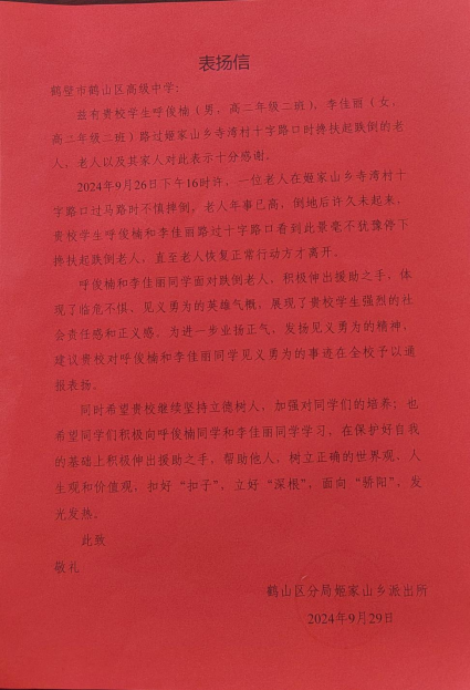 善举暖人心 助人展风采 本网鹤壁讯:(夏建胜 石文军)助人为乐是中华民族的传统美德,也是一个人良好道德风尚和崇高社会责任感的具体体现。近日,鹤山高中高二两位学生的善举,成为了整个校园的一抹亮丽风景。 高二二班学生呼俊楠、李佳丽,在放学途中,偶遇一位不慎摔倒的老人,没有丝毫犹豫,他们快步上前,小心翼翼地将老人扶起并一直陪伴在老人身边,直到确定老人身体无大碍并联系上老人的家人后才悄然离开。 随后,老人的家人委托姬家山乡派出所民警寻找这两位好心的学生,并给学生送来了感谢信,学校得知此事后,对呼俊楠、李佳丽进行了表彰,他们的事迹在校园里广泛传播,同学们纷纷为他们点赞,以他们为榜样,这种正能量的传递,让整个校园都洋溢着温暖与关爱。 编辑 夏建胜 微信扫一扫,阅读更方便^_^ |
