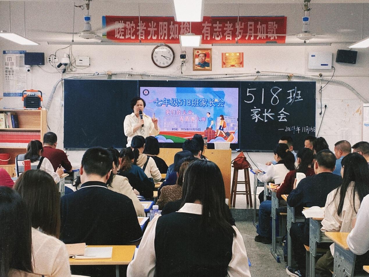 会议伊始,章燕校长通过校园广播系统向全体家长介绍了学校的整体发展规划、教学理念以及近期取得的各项成果。同时,章校长强调,初中阶段是学生成长的关键时期,学校注重培养学生的综合素质,不仅关注学业成绩,还重视品德修养、身心健康等多方面的发展。 随后,各班班主任在教室与家长进行了面对面的交流。